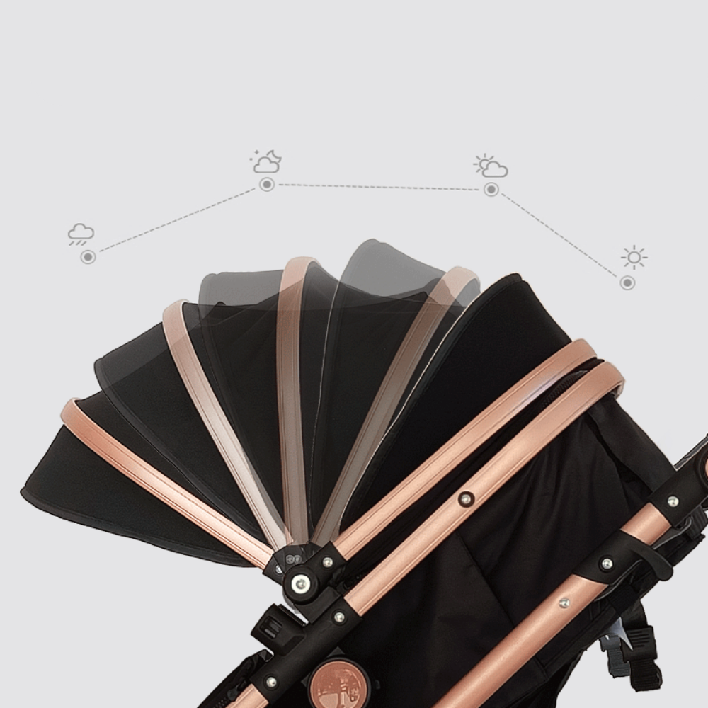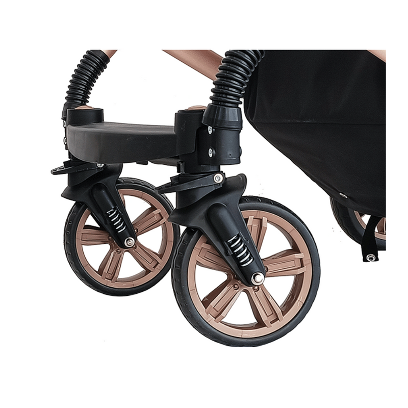 La technologie avancée d'amortissement des chocs de notre poussette garantit une conduite incroyablement fluide et confortable, absorbant les irrégularités du terrain et créant un environnement parfait pour votre enfant.