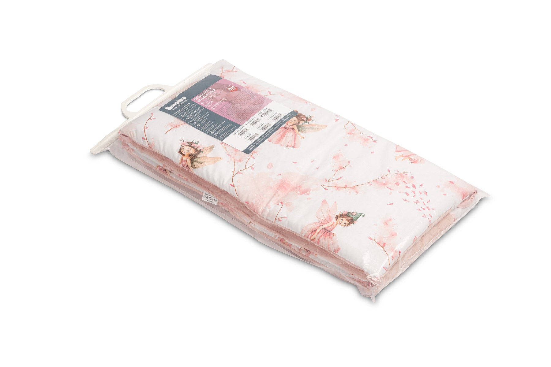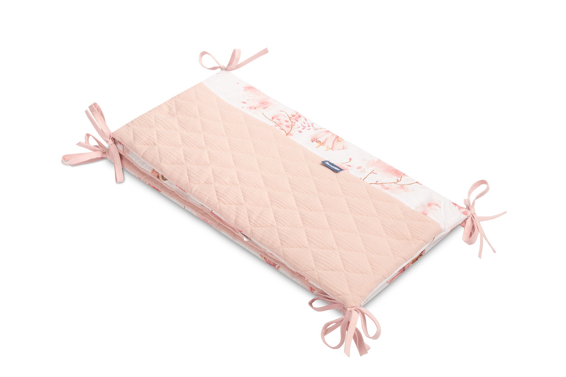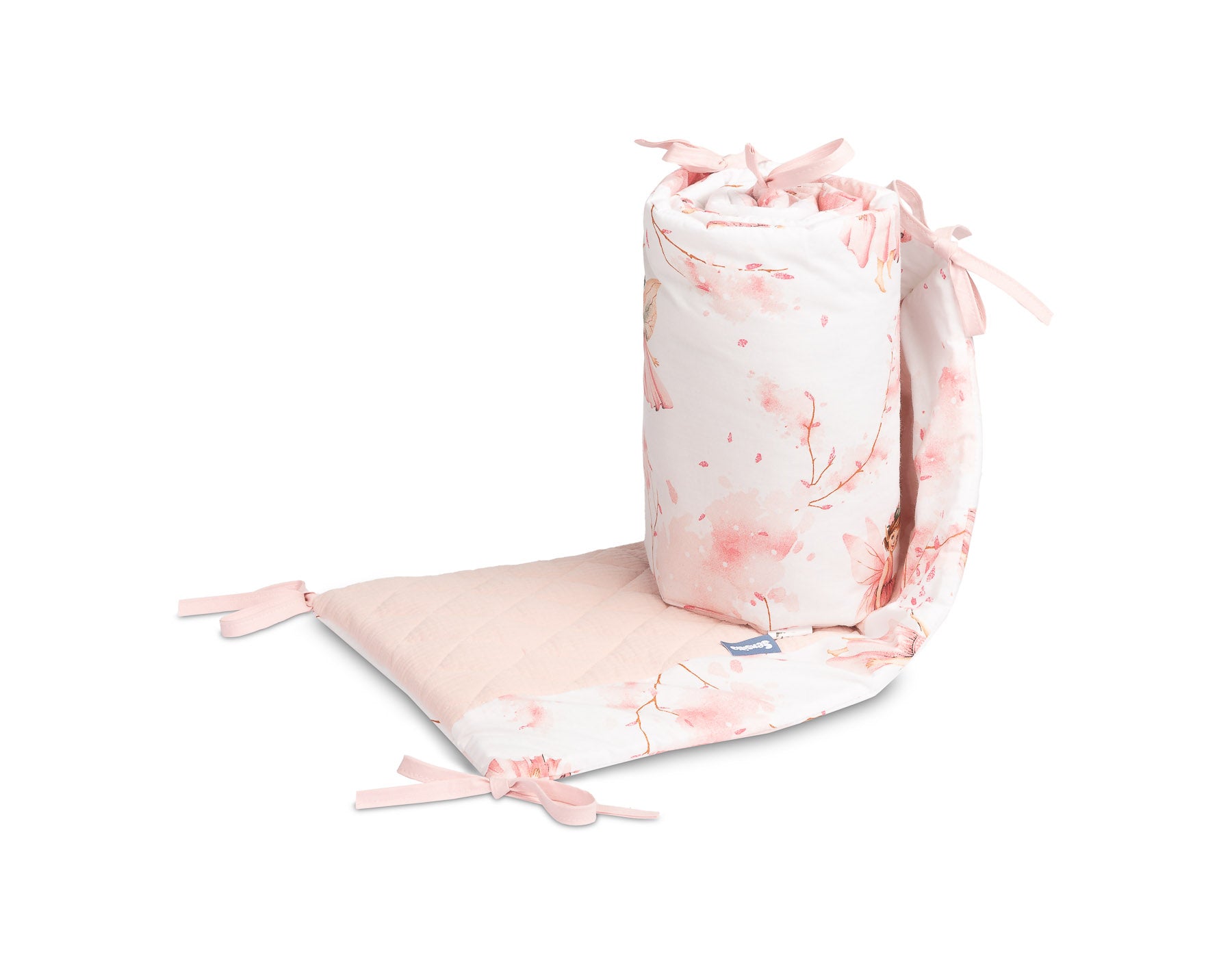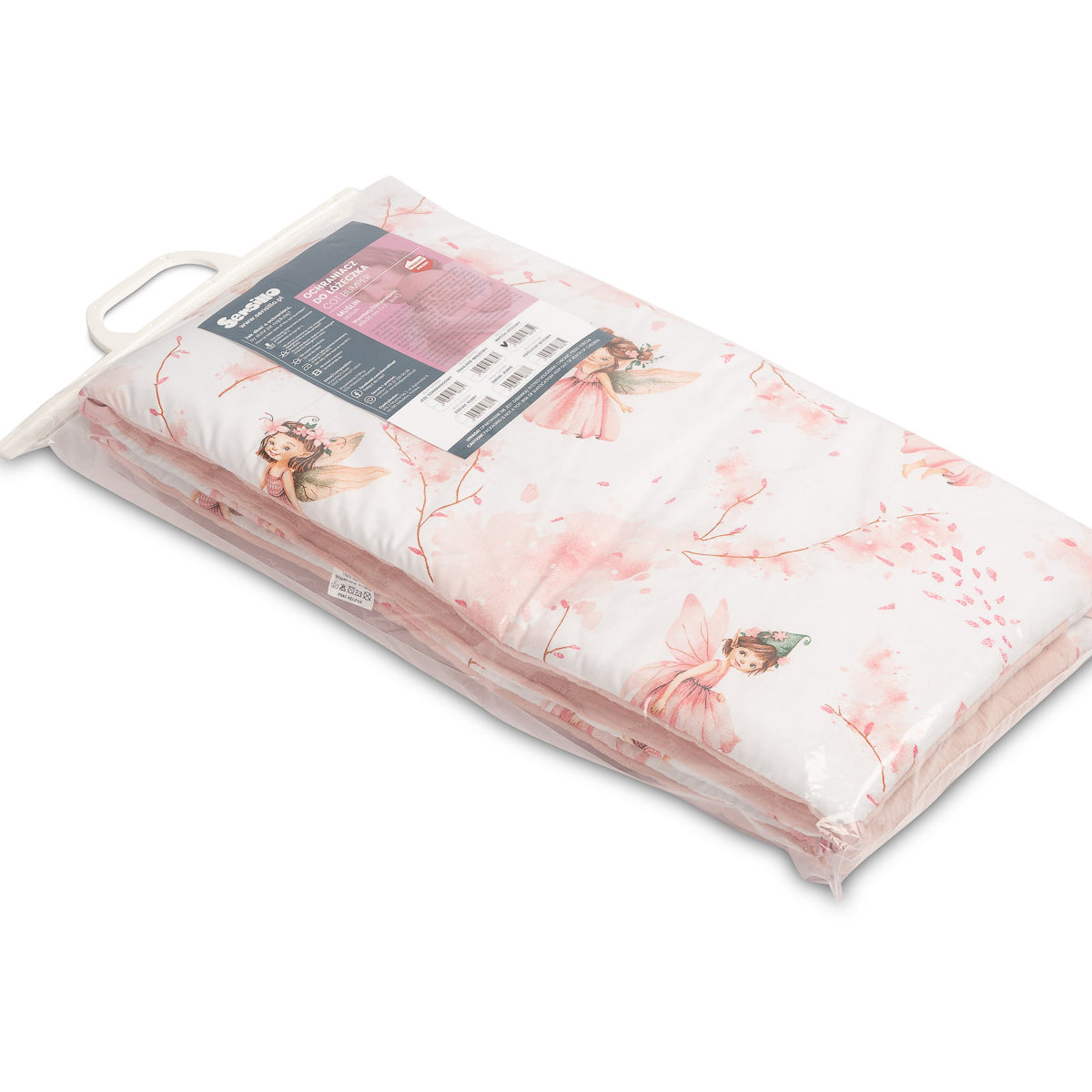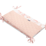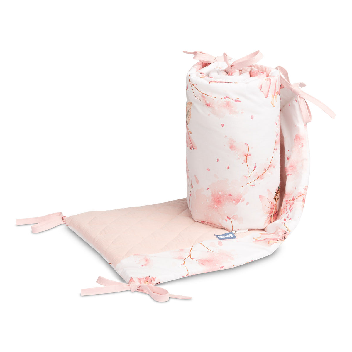 Le tour de lit protecteur s'adapte à chaque lit bébé standard. Le tour est fait de coton imprimé doux et de mousseline agréable au toucher. Le rembourrage en polyester protégera le bébé des blessures pendant ses mouvements dans le lit. Le tour reste en place grâce aux rubans qui l'attachent aux barreaux du lit. Il est destiné à un lit de dimensions 120x60 cm. Le tour sera un excellent ajout à l'équipement pour bébé.
